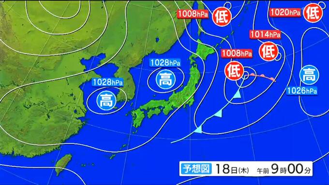 18日午前9時の予想天気図です。東北地方は午前中、寒気や気圧の谷の影響を受けやすいですが、午後は移動性の高気圧に覆われるでしょう。
