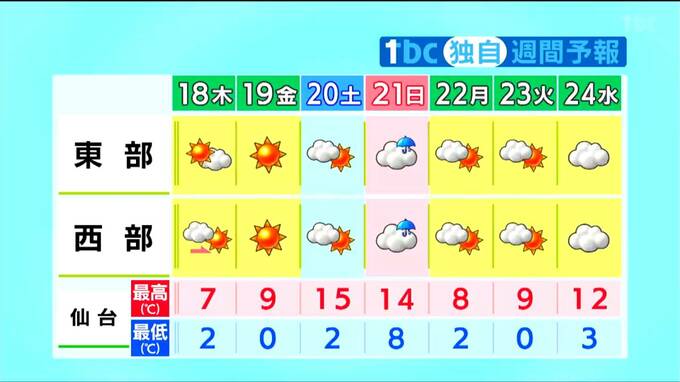 最低気温は、17日朝と同じかやや低く、広い範囲で氷点下の冷え込みとなる見込みです。最高気温は、きょうより2、3℃低く、平年よりやや低いでしょう。