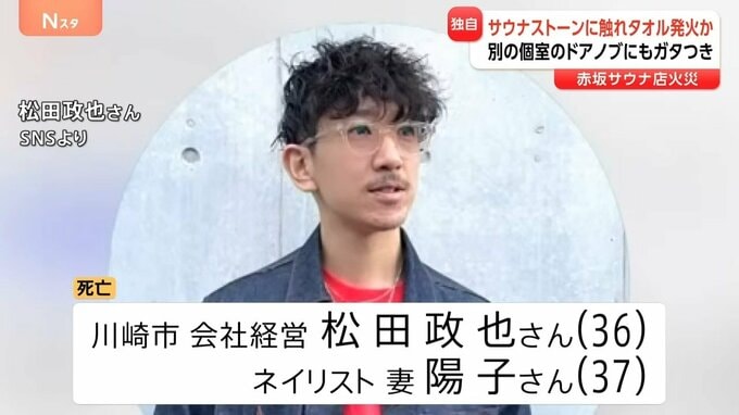 この火事は、おととい午後0時半ごろ、港区・赤坂の個室サウナ店で背もたれなどが焼け、室内で倒れていた川崎市の会社経営・松田政也さん(36)と妻でネイリストの陽子さん(37)が死亡したものです。