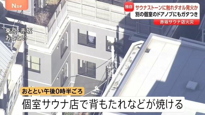 東京・赤坂の個室サウナ店で夫婦が死亡した火事で、サウナ室の中で見つかった燃えたタオルについて、サウナストーンに触れたことで発火したとみられることがわかりました。