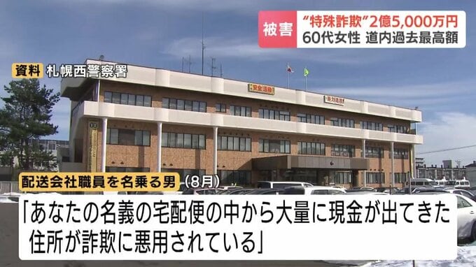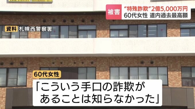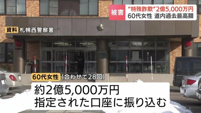 札幌市西区の60代の女性が、北海道内の特殊詐欺の被害で過去最高額となる約2億5000万円をだまし取られました。
