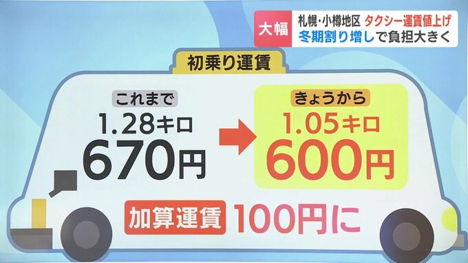 初乗り運賃はこれまで1.28キロで670円でしたが、17日からは1.05キロで600円に。札幌で80円だった加算運賃も100円になります。