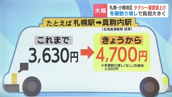 北海道運輸局の試算では、札幌駅から約10キロ離れた真駒内駅までタクシーに乗った場合、16日までだと3630円でした。これが17日からは、冬の2割増しが適用になるため、4700円と1000円近く高くなる計算です」