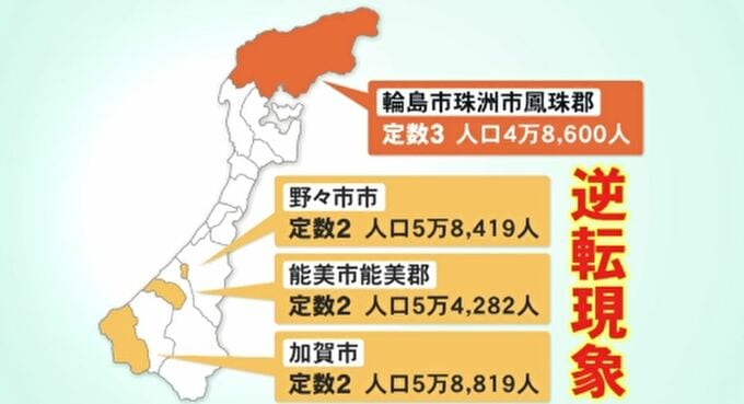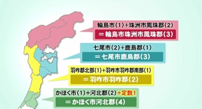 一方、この案では、合区後の「輪島市珠洲市鳳珠郡選挙区」の議員定数は、合区前の定数を合わせた3が維持されます。この場合、人口がより多いにもかかわらず、定数が2のままの「加賀市」と「能美市能美郡」、「野々市市」の選挙区との間で逆転現象が起こります。