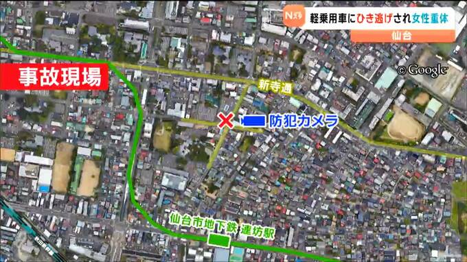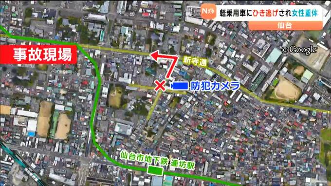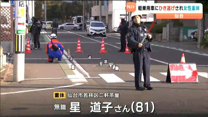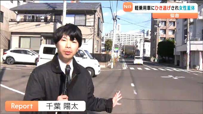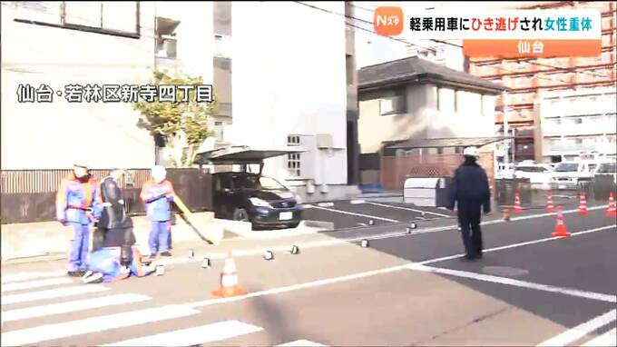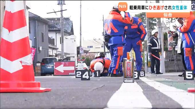 17日早朝、仙台市内の交差点で女性が軽乗用車にはねられ意識不明の重体となっています。はねた車は、現場から逃走していて、警察がひき逃げ事件として捜査しています。