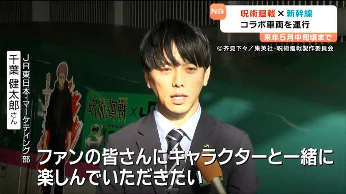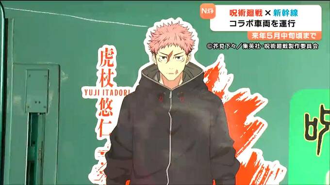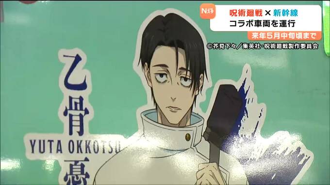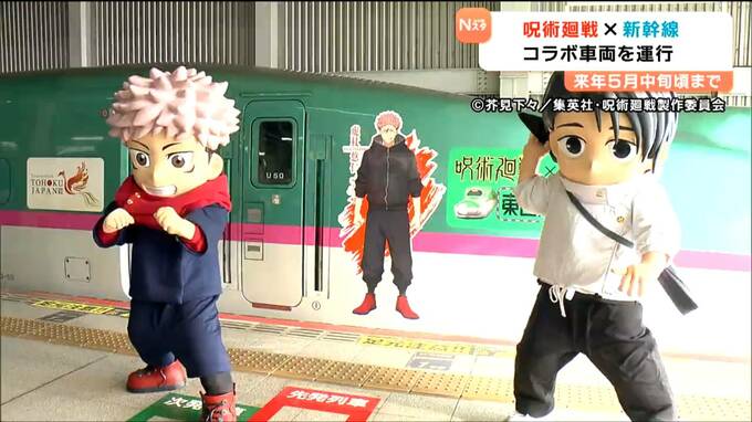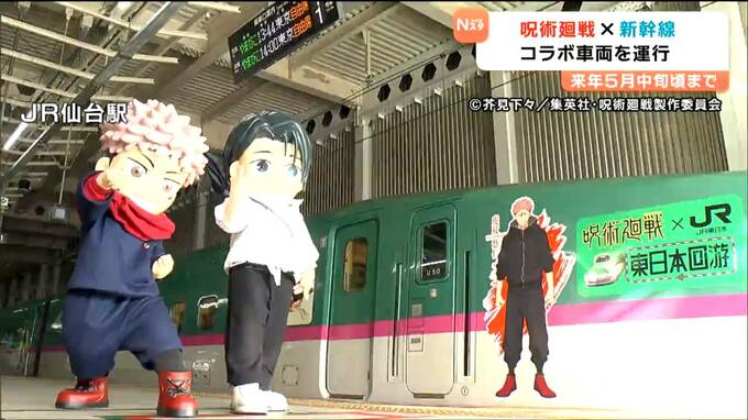 人気漫画「呪術廻戦」のキャラクターをラッピングした新幹線の車両が、JR仙台駅で報道公開されました。17日から2026年5月まで運行されます。