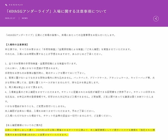 12月に開催される、「40thSGアンダーライブ」公演で「すべてのお客さまに『手荷物検査』『金属探知機による検査』『ご本人確認」を実施させていただきます。」と、公表しました。