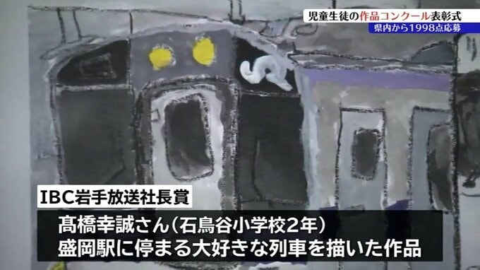 特選のうちIBC岩手放送社長賞を受賞した花巻市の石鳥谷小学校2年、高橋幸誠さんの絵画は、「お気に入りの場所」をテーマに盛岡駅に停まる大好きな列車を描きました。