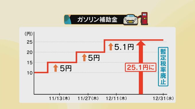 6週連続値下がりとなったガソリン価格。暫定税率分25.1円の12月末での廃止に向けて12月11日にかけて段階的に増額された政府の補助金が価格に反映されました。