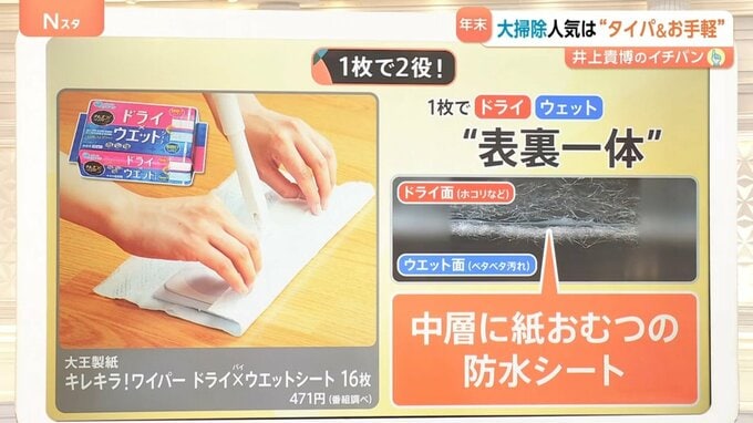大王製紙 の「キレキラ!ワイパー ドライ×ウエットシート 16枚(471円 / 番組調べ)」は、ドライとウエットが裏表で1枚になったワイパーシートです。