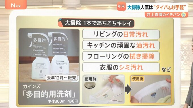 カインズ の「多目的用洗剤(本体300ml 498円 )」は、キッチンと風呂場で使う洗剤が1つになった商品です。▼リビングの日常汚れ▼キッチンの頑固な油汚れ▼フローリングの拭き掃除▼衣類のシミ汚れなどに適しているということです。