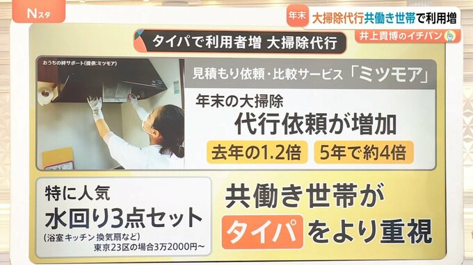大掃除の代行利用も増えているようです。見積もり依頼・比較サービスの「ミツモア」によると、年末の大掃除の代行依頼が2024年と比べると1.2倍、5年で約4倍に増加しているということです。