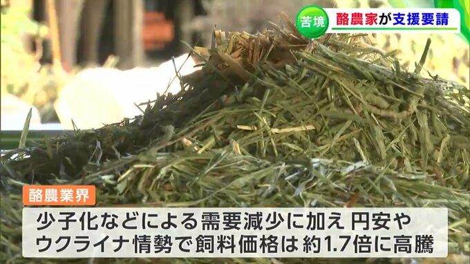 少子化などで牛乳の需要が減ってきたことに加え、極端な円安やウクライナ情勢により飼料価格はコロナ禍前の約1.7倍に高騰。酪農経営はこれまでにない苦境に陥っているといいます。要望書では資金面での支援などを求めました。