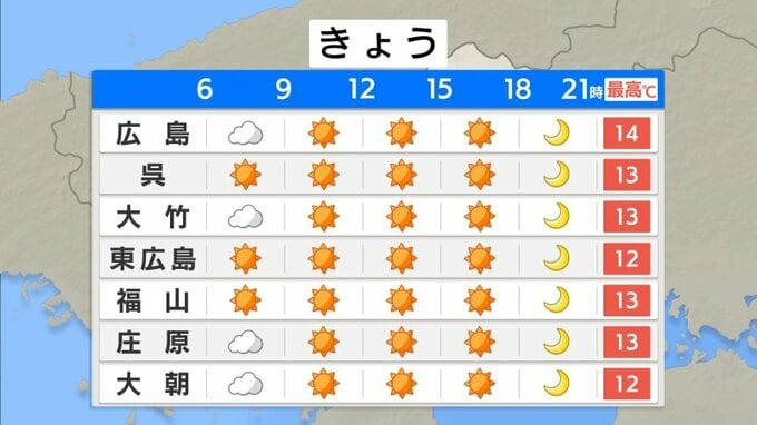 この後、全域で雲や霧がとれてきて、各地でよく晴れるでしょう。上空にはこの時期としては高い気温の空気が入るため、これから週末にかけて11月並の暖かさなる予想です。きょうの予想最高気温は、広島14℃、呉・福山・庄原13℃、日差しのぬくもりを感じられるでしょう。
