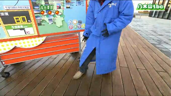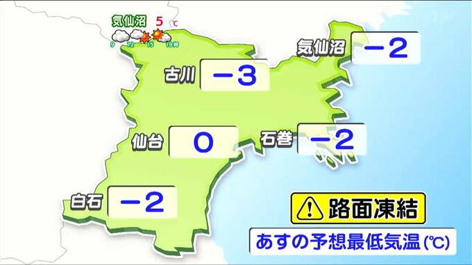 18日朝は各地で路面の凍結が見られています。仙台市内のウッドデッキも凍って滑りやすい状態となっており、他の地域でも路面が凍結しているところがあります。車を運転される方はスリップに十分注意してください。