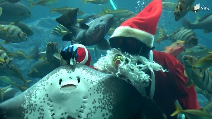 静岡県下田市の下田海中水族館では、クリスマスに向けてサンタクロースの衣装を着たダイバーによる餌付けショーが行われています。大水槽に現れたのは、真っ赤な衣装に立派な口ひげを蓄えたサンタクロースです。下…