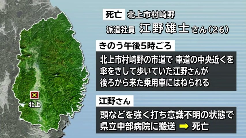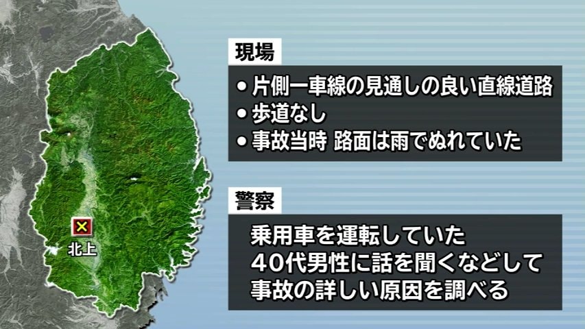 北上警察署によりますと、17日午後5時ごろ、北上市村崎野の市道で車道の中央近くを傘を差して歩いていた江野さんが、後ろから来た乗用車にはねられました。