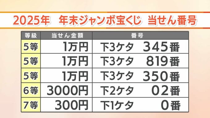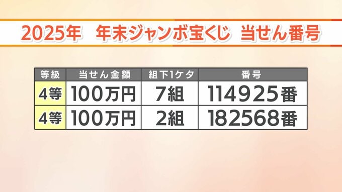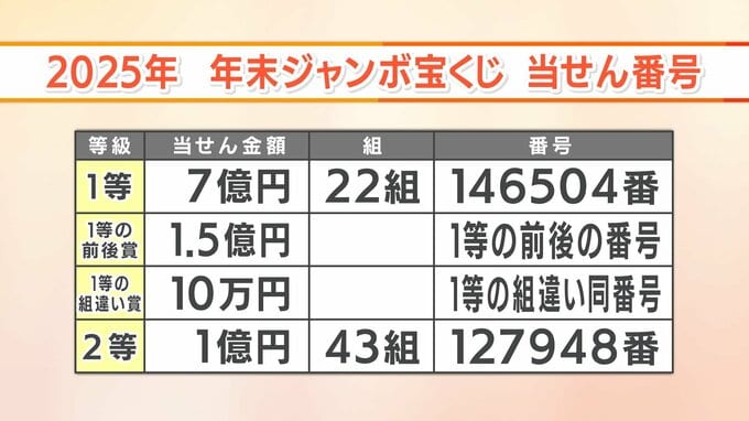 【速報】年末ジャンボ当選番号発表!7億円の行方は? “億万長者”アンケート結果も あいテレビ 2025年12月31日(水) 13:35 国内 2025年を締めくくる、最後にして最大の運試し。 「年末ジャンボ宝くじ」の抽選が行われました。 ◆【結果速報】 運命の分かれ道! 1等7億円は誰の手に? 1等 22組 146504番