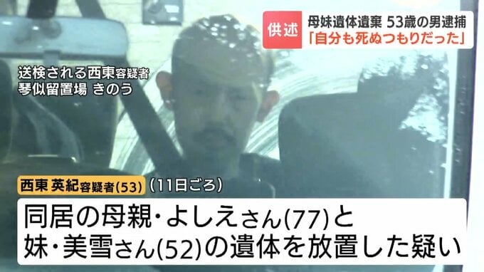 札幌市南区の会社員、西東英紀容疑者(53)は、12月11日ごろ、自宅で同居する母親のよしえさん(77)と妹の美雪さん(52)の遺体を放置した疑いが持たれています。