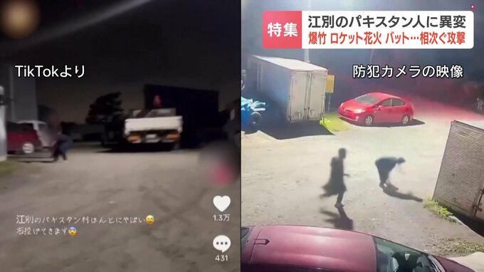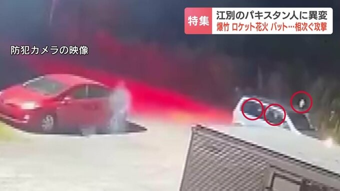 投稿された映像の約1分前、店の前に1台の車がとまりました。すると、車の助手席から突然、店に向かって爆竹を投げつけます。映像からは、少なくとも3人の人物が確認できます。