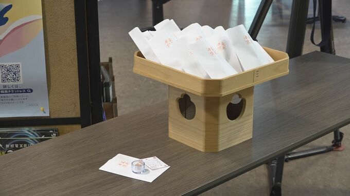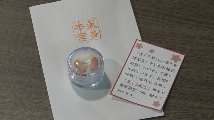 JR七尾駅で駅員たちが配布したのは、淡いピンク色をした「さくら貝」のお守り。