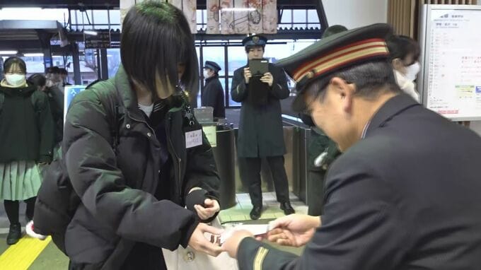 改札口前では18日朝、社員4人が「【ご】うか【く】」にちなんで59個のお守りを配り、通学途中の受験生らを励ましました。