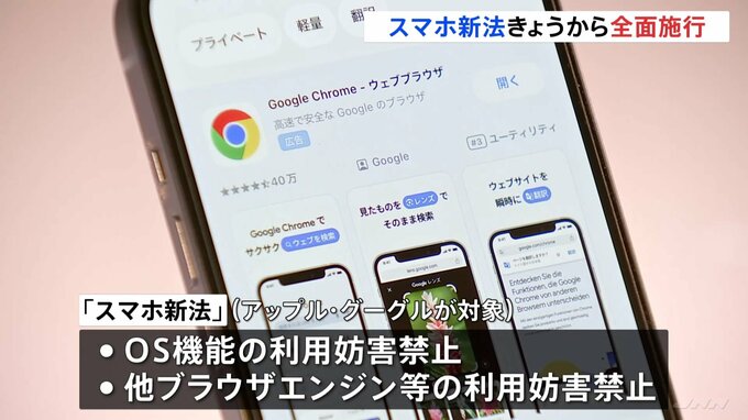 スマホアプリ市場で自由な競争を促すため、きょうから「スマホ新法」が全面施行されました。対象となるのはアップルとグーグルです。国内のスマホ市場では、アップルのiPhoneとGoogle Androidが4000万人以上のユ…