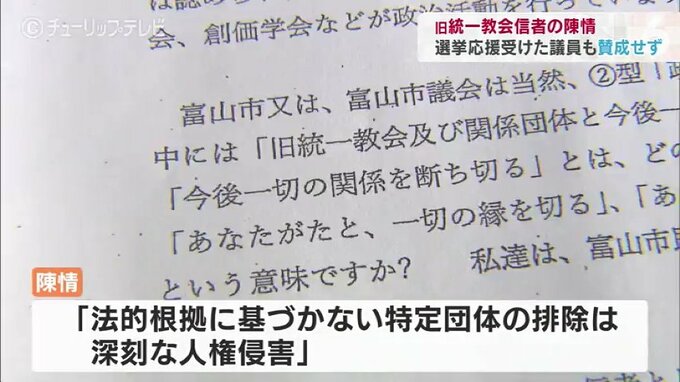 旧統一教会の信者が富山市と藤井市長に対して特定団体を排除しないよう求めた陳情について、富山市議会の委員会は不採択としました。教団から選挙応援を受けた議員も不採択に賛成しています。