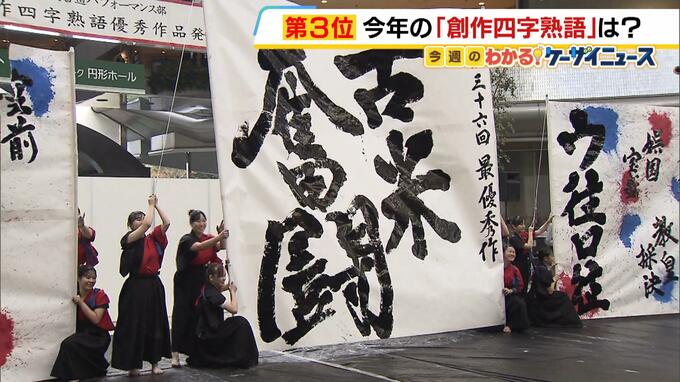 上宮高校書道パフォーマンス部の生徒たちが力強く書き上げるのは、今年の世相を表す「創作四字熟語」。 一年の出来事をオリジナルの熟語で振り返るというもので、公募から作品が選ばれます。 ゲストのミャクミャ…
