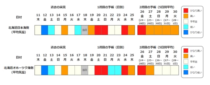 北海道地方の向こう2週間の気温は、寒気の影響が弱く、暖かい空気が流れ込む日もあるため平年並か高い日が多く、24日頃からはかなり高くなる可能性があります。