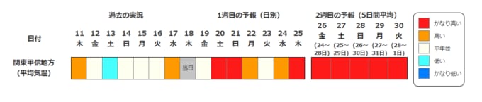 関東甲信地方の向こう2週間の気温は、寒気の影響が弱く、暖かい空気が