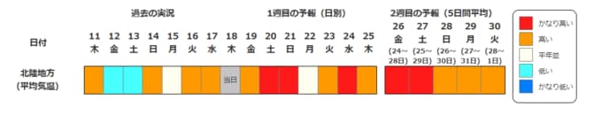 北陸地方の向こう2週間の気温は、寒気の影響が弱く、暖かい空気が流れ