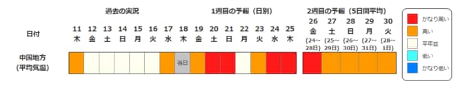 中国地方の向こう2週間の気温は、寒気の影響が弱く、暖かい空気が流れ