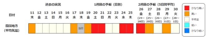 四国地方の向こう2週間の気温は、寒気の影響が弱く、暖かい空気が流れ