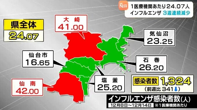 12月8日の週、宮城県内の定点医療機関でインフルエンザと診断された人の数は、1医療機関あたり24.07人でした。3週連続で減少したものの、宮城県は依然、感染者が多いとして感染対策を呼びかけています。宮城県によ…