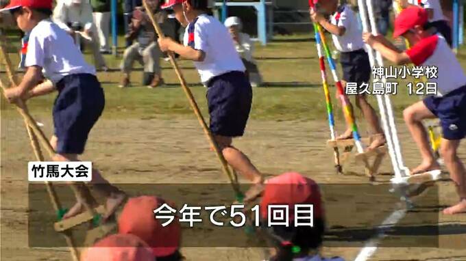 屋久島町の神山小学校で行われたのは、今年で51回目の竹馬大会です。門松を作ったときに余った木材で竹馬を作り、冬休みに学校で遊んだことがきっかけだといわれています。