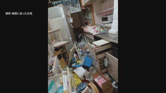 地震発生当時は就寝中だったという女性。最大震度6強の揺れにより、家具やキッチン用品などは部屋中に散乱。大きな家具には、金具をつけて地震対策をしていたものの、その対策を上回る揺れが女性の住宅を襲いました。