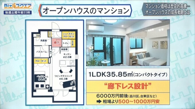 リビングダイニングの隣は収納式の仕切りを備えたベッドルーム(約4.3畳)という間取りで、価格は品川区・台東区などの都心で「6000万円」前後。相場より“500〜1000万円割安”だという。
