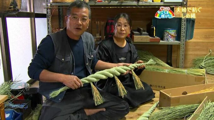 こちらは鹿児島市川上町の「わら工房 時代屋」です。黙々としめ縄を作っているのは、篠田時正さん、政代さん夫婦。