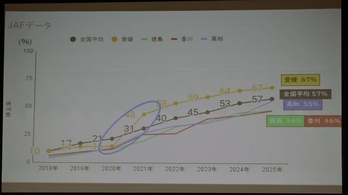 2020年〜2021年の愛媛県のポイントが上昇したことについては、「講話を聞いて賛同した教員や生徒、保護者、卒業後に免許を取った若者が実践した結果だと思います」と述べました。