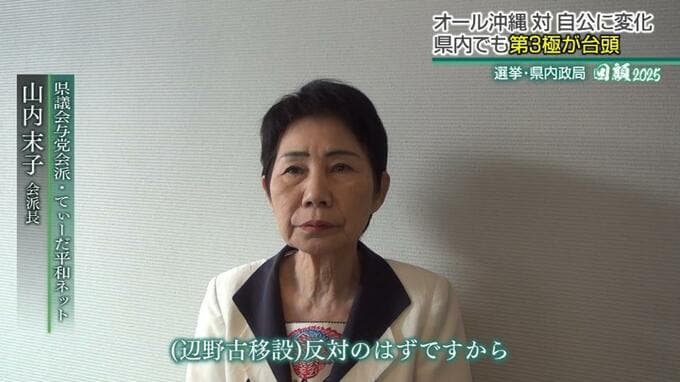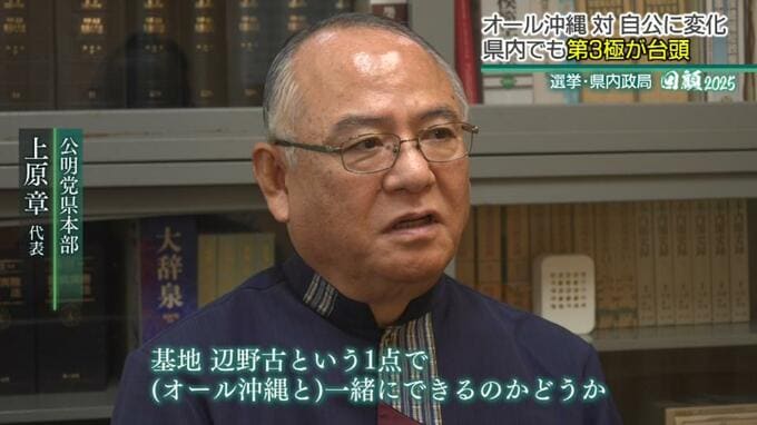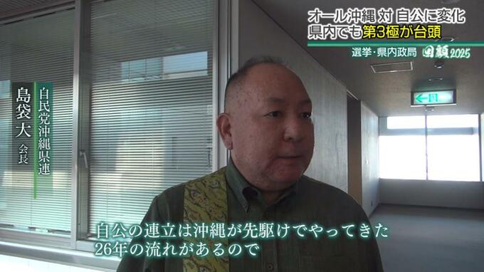 「基地、辺野古という一点で(オール沖縄と)一緒にできるのかどうかという、こ れもまた県本部の中でも議論しなくちゃいけないんですけど、やっぱり過去の知事選含めると、どうしてもやっぱり沖縄県の振興発展、この部分は外せないわけですから、その辺はもうしっかり総合的に判断をしていきたいなと思っています」