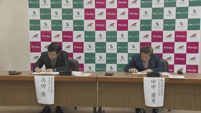 丸久の田中康男社長と周南公立大学の高田隆学長が、協定書に署名しました。