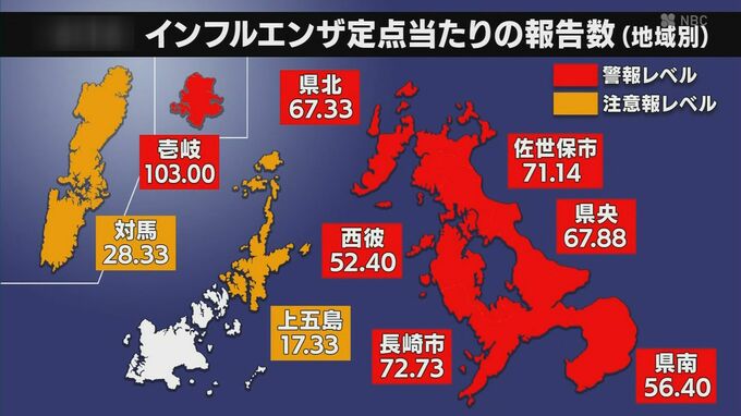 インフル猛威 長崎では「警報レベルの2倍」患者の8割超は10代以下 長崎放送 2025年12月18日(木) 18:32 国内 長崎県内で直近1週間に報告されたインフルエンザの患者数は、前週に比べ2割以上増加し、4週続けて「警報レベル」の報告数となりました。