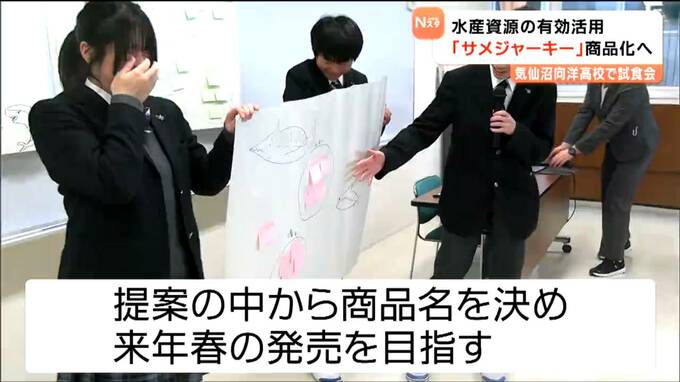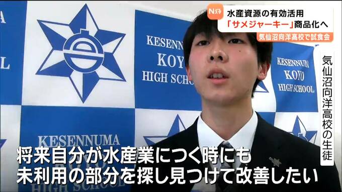 気仙沼で水揚げされたサメの肉を使った「サメジャーキー」の試食会が気仙沼市の高校で開かれ生徒たちが商品化に向けてアイデアを出しました。