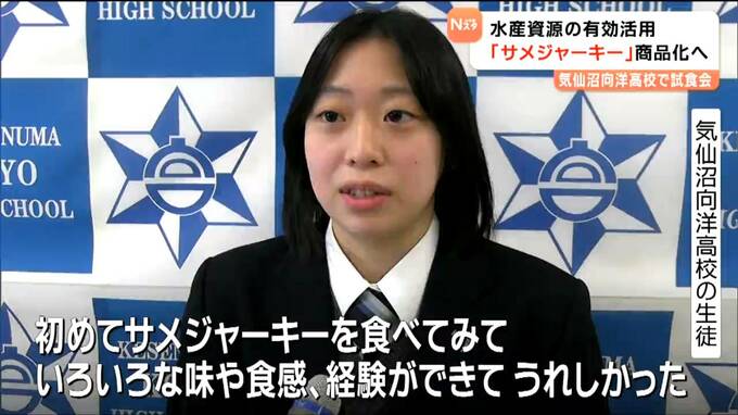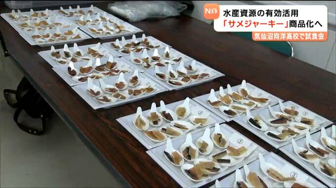気仙沼向洋高校気仙沼向洋高校で開かれた試食会には、2年生の生徒や水産加工会社の担当者など50人が参加しました。この取り組みは気仙沼で水揚げされあまり有効活用されていないヨシキリザメの肉を使ったサメジャーキーの商品化を目指すものです。