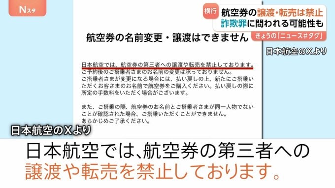 年末の帰省シーズンが近づく中、飛行機のチケットにまつわる“ある問題”が巻き起こっています。こちらは先週、大手航空会社「日本航空」がXに投稿した内容。日本航空のX「日本航空では、航空券の第三者への譲渡や…