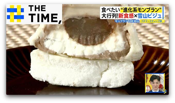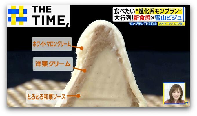 雪山をイメージした真っ白な円すい形で、和栗風味のホワイトマロンクリームとラム酒香る洋栗クリームの2層仕立て。中にはとろとろ和栗ソースと渋皮栗が1粒丸ごと入っています。人気の理由は…これまでにはない“新食感”。