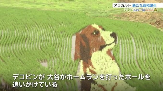 ふるさとの奥州市水沢佐倉河の田んぼに現れたのは豪快なスイングをする大谷選手と愛犬のデコピンです。
