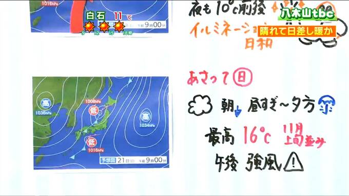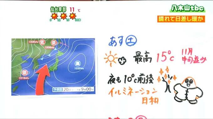 高気圧がだいぶ東の方に離れていきますので、少し雲は出るものの、日差しも十分届きそうです。19日以上に暖かな空気が流れ込んで、最高気温は仙台で15℃などと11月中旬並みになります。20日は夜も気温が高いというのが特徴で、イルミネーションも快適に楽しむことができそうです。