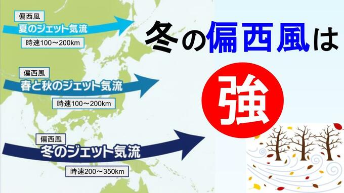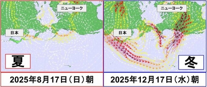 偏西風の強いところを「ジェット気流」と言うのですが、冬のジェット気流は特に強くて、夏のジェット気流が時速100km~200kmだとすると、冬のジェット気流は200km~350kmになります。偏西風は西から東に向かって吹くので、日本からニューヨークに行く飛行機は追い風効果で飛行時間が短くなるのです。